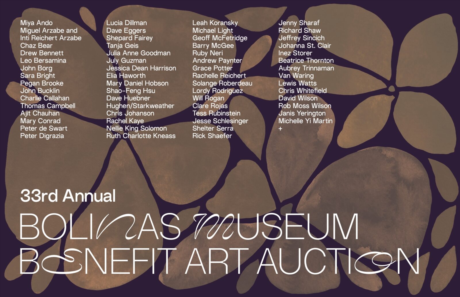 PARTICIPATING ARTISTS | Miya Ando • Miguel Arzabe and Inti Reichert Arzabe • Chaz Bear • Drew Bennett • Leo Bersamina • John Borg • Sara Bright • Pegan Brooke • John Bucklin • Charlie Callahan • Thomas Campbell • Ajit Chauhan • Mary Conrad • Peter de Swart • Peter Di Grazia • Lucia Dillman • Dave Eggers • Shepard Fairey • Tanja Geis • Julia Goodman • July Guzman • Jessica Dean Harrison • Elia Haworth • Mary Daniel Hobson • Shao-Feng Hsu • Hughen/Starkweather • Chris Johanson • Rachel Kaye • Nellie King Solomon • Ruth Charlotte Kneass • Leah Koransky • Michael Light • Geoff McFetridge • Barry McGee • Ruby Neri • Andrew Owen • Andrew Paynter • Grace Potter • Rachelle Reichert • Solange Roberdeau • Lordy Rodriguez • Clare Rojas • Will Rogan • Tess Rubinstein • Jesse Schlesinger • Shelter Serra • Rick Shaefer • Jenny Sharaf • Richard Shaw • Jeffrey Sincich • Johanna St. Clair • Inez Storer • Beatrice Thornton • Aubrey Trinnaman • Van Waring • Lewis Watts • Chris Whitefield • David Wilson • Rob Moss Wilson • Janis Yerington • Michelle Yi Martin + more!